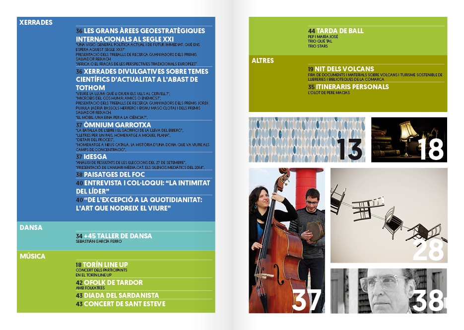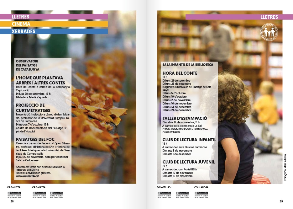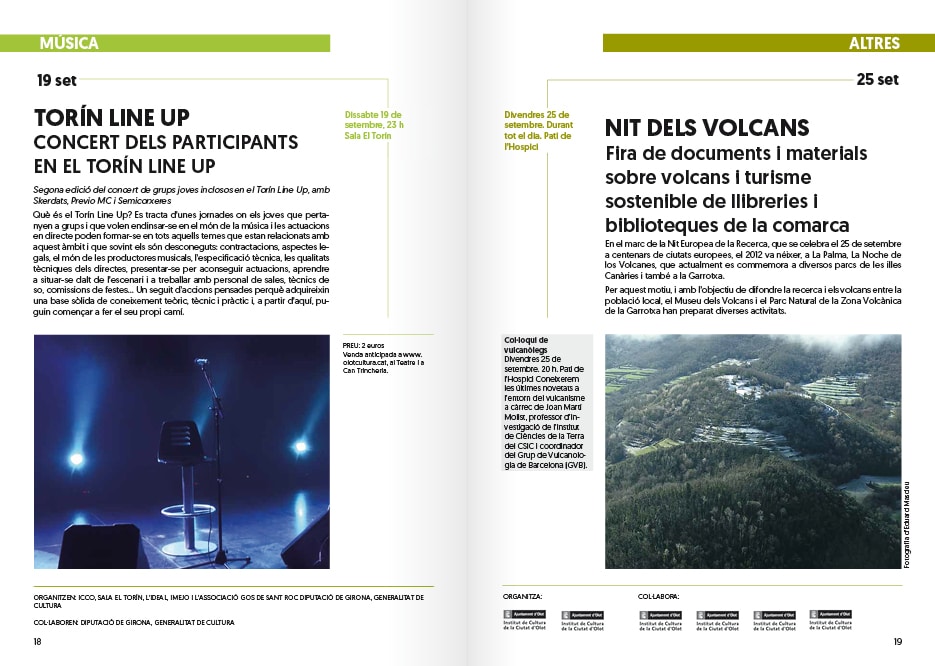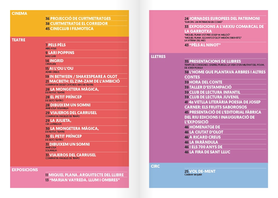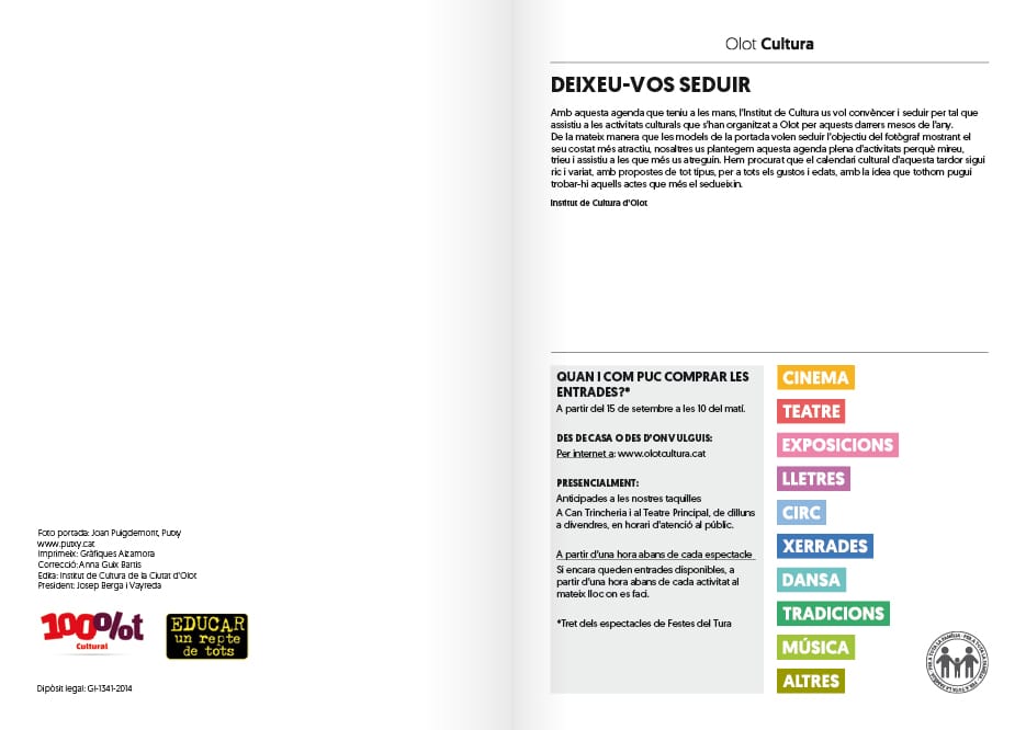 Ens han encarregat el redisseny de l’Agenda de Cultura d’Olot. Havia de ser una evolució, no un trencament, que mantingués l’estil propi de l’Agenda procurant una millor funcionalitat d’aquesta. El brífing també incloïa pensar de nou el logotip d’Olot Cultura. La nova imatge havia de transmetre elegància i proximitat a tots els públics, per això vàrem buscar una tipografia que fos de pal sec i rodona, que denotés amb les seves formes amables un caràcter més proper. Es va ressaltar la paraula “Cultura” per sobre d’Olot, per tal de ser més immediats en la seva intenció de comunicació. El redisseny de l’Agenda el vàrem enfocar a partir de les dificultats que vàrem observar en ella: els pictogrames eren en diferents estils i després de treballar diferents opcions es va escollir utilitzar franges de colors segons les disciplines culturals d’una manera senzilla, clara i entenedora. Així també es va treballar en la gràfica d’un segell que marquès les activitats per a tots els públics. Per un altre costat, les dates de les activitats culturals ordenades cronològicament havien de ser accessibles d’una forma ràpida i ho vàrem solucionar col·locant-les a la part superior externa de la pàgina. La informació de quan, hora i lloc va agafar caràcter donant-li color segons la categoria de l’activitat. L’estructura de la pàgina pren així més ordre i facilita la lectura. No es va trencar amb les caixes-semitransparents de la segona part de l’Agenda on es col·loquen les informacions que van més enllà d’una activitat, però se’ls ha afegit les franges de colors per a situar al públic a l’hora de saber a quin àmbit cultural pertanyen. S’ha elaborat un full d’estils per al canvi de tipografia i estructura d’arreu de l’Agenda. Per últim i com a element plenament nou s’ha creat un índex, indispensable per a facilitar una cerca ràpida de la programació cultural segons l’interès de cadascú.
