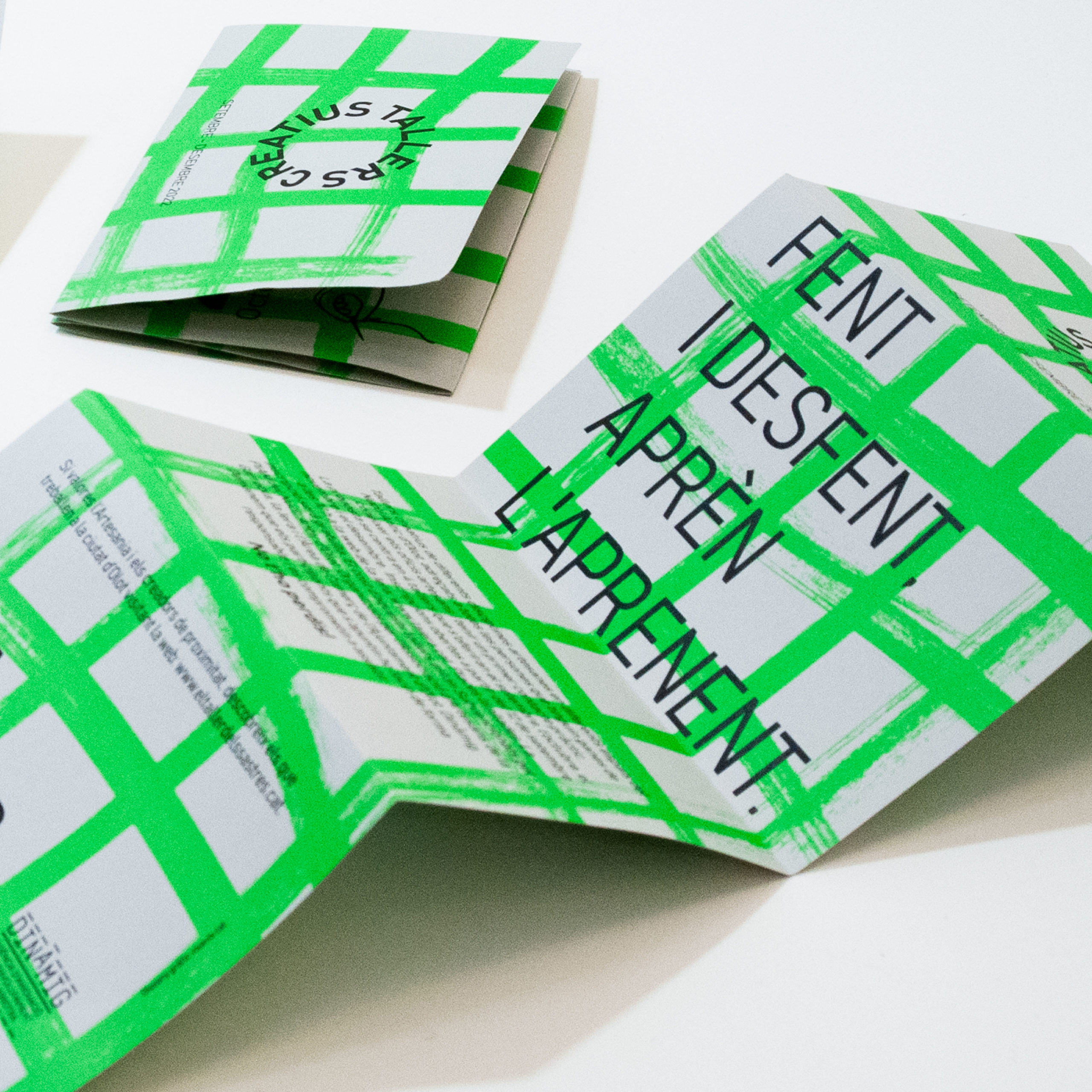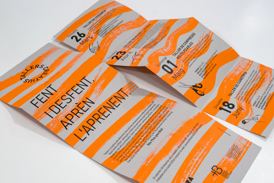 Campanya de comunicació per a l’Associació de Creadors de la Garrotxa. Creació d’imatge dels cicles creatius. Els tallers que s’ofereixen als ciutadans volen potenciar l’experiència dels oficis artesans i promoure la seva valorització dins la zona del Nucli Antic d’Olot. Es va idear un format vertical a dues cares que servís com a cartell per als aparadors de les botigues i que es trobés també plegat a 4 cossos com a quadríptic. Per tal de reforçar el missatge del treball manual es varen treballar amb traços que recordessin les pinzellades manuals amb colors de tinta plana fluorescents. Aquests traços canvien de color en funció de l’edició, així doncs en la primera es va fer servir el color taronja i en la segona el color verd. En edicions següents es podrà continuar jugant amb altres colors per indiciar que es tracten d’edicions diferents de tallers. Les icones que acompanyen els textos explicatius de cada taller són fets especialment per aquesta campanya.
